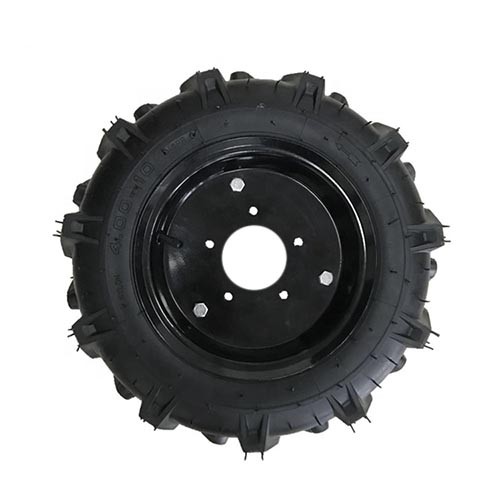 Колесо размерностью 4х10 дюйма с установленной на него покрышкой и камерой. Устанавливается на прицепы, мотоблоки, культиваторы и другую садовую технику. Рисунок направленная елочка. Посадочное на 5 болтов