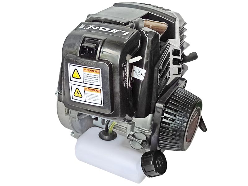 Топливный бак и сцепление в комплекте. Максимальная частота вращения до 6500 об/мин., низкий уровень шума, легкий (4 кг), ручной запуск и низкий расход топлива. Так двигатель отличает высокое качество и большой моторесурс, что позволяет ему пользоваться повышенным спросом среди профессионалов.