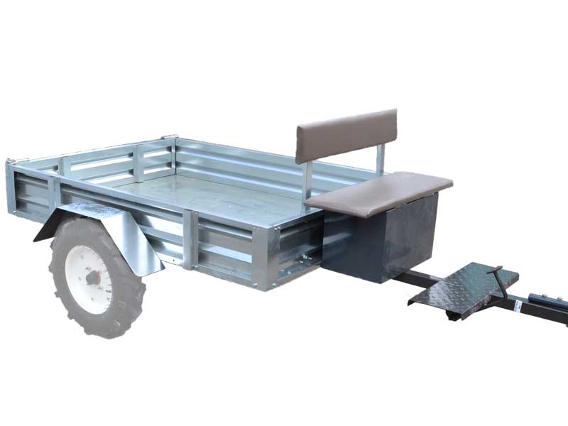 Прицеп ТМ-6/400 с инструментальным ящиком и мягким сиденьем, грузоподъемность до 400 кг. Тормоза ленточные с педалью тормоза.